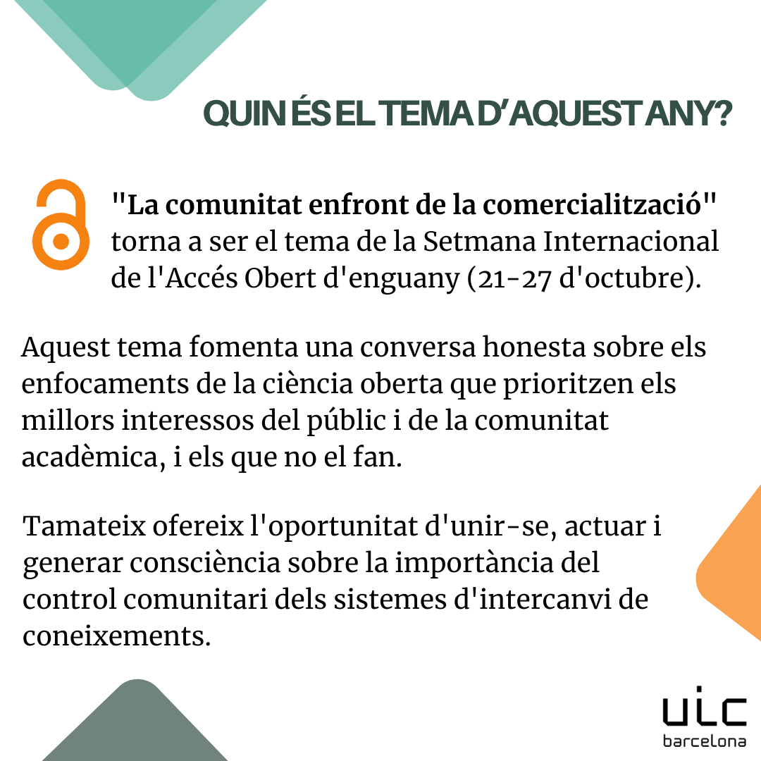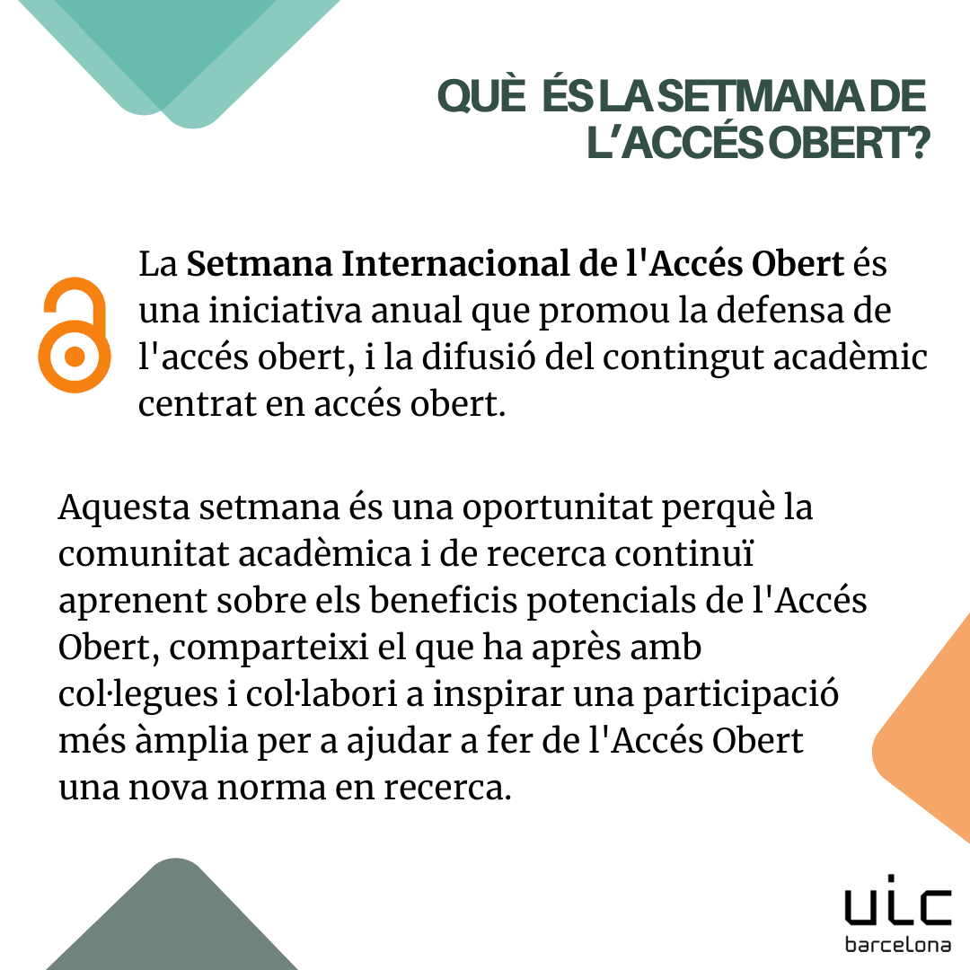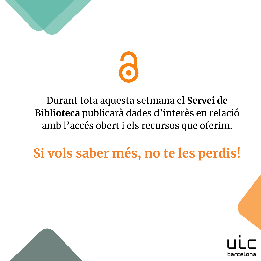 En aquesta setmana es duu a terme la Setmana Internacional de l'Accés Obert 2024. El lema d'aquest any torna a ser "La comunitat enfront de la comercialització". Des de la Biblioteca UIC Barcelona volem formar part d'aquest moviment i mostrarem en els següents dies temes relacionats amb l'accés obert i els recursos que oferim des de Biblioteca. Avui iniciem amb què és l'accés obert i la seva importància. Més informació a l'enllaç de la bio ⬆️ (OA WEEK 2024)
