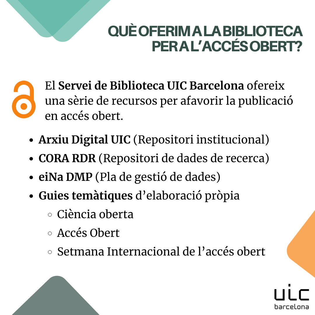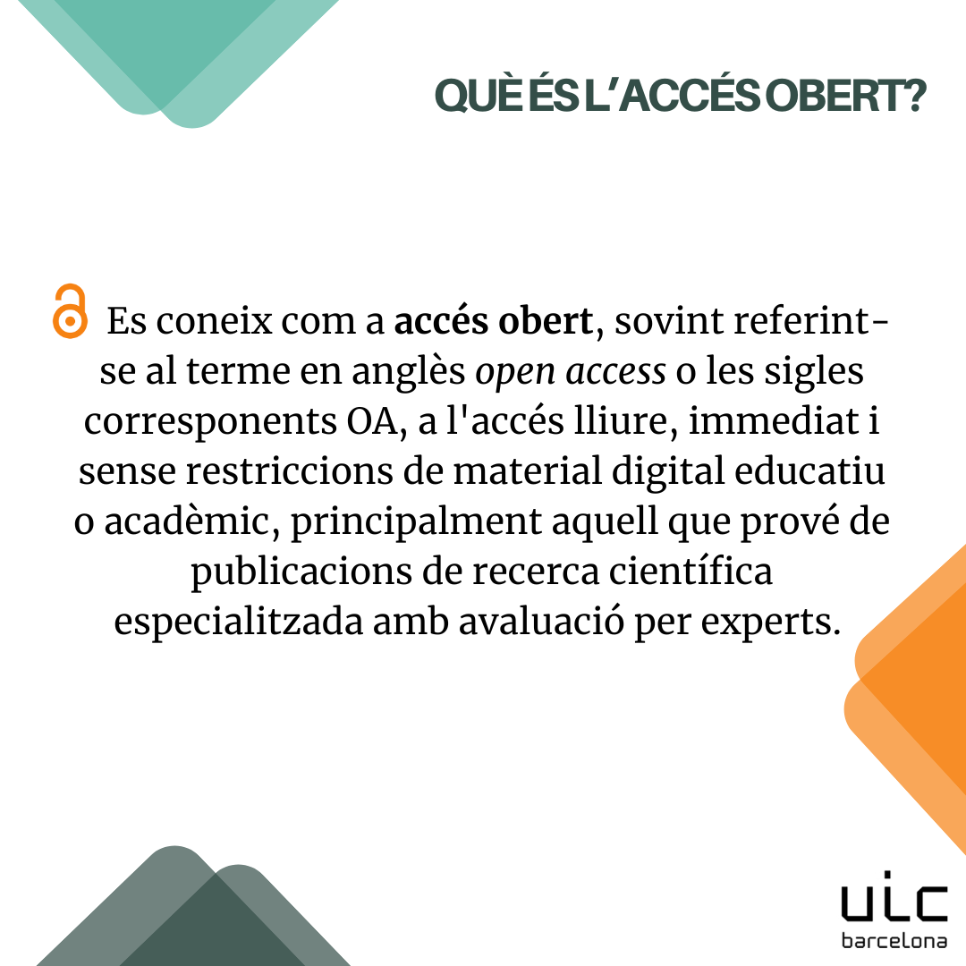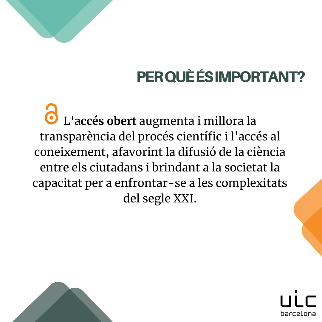 En aquesta setmana es duu a terme la Setmana Internacional de l'Accés Obert 2024. El lema d'aquest any torna a ser "La comunitat enfront de la comercialització". Des de la Biblioteca UIC Barcelona volem formar part d'aquest moviment i mostrarem en els següents dies temes relacionats amb l'accés obert i els recursos que oferim des de Biblioteca. Avui iniciem amb què és l'accés obert i la seva importància. Més informació a l'enllaç de la bio ⬆️ (OA WEEK 2024)