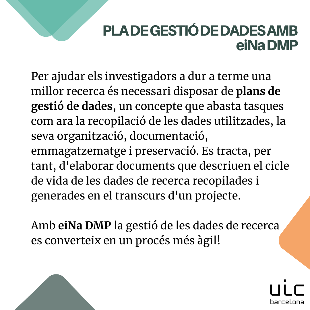 eiNa DMP és el recurs que compartirem avui amb relació a l'accés obert. Aquesta eina serveix per crear pla de gestió de dades. Podeu consultar més informació: https://biblioguias.uic.es/acceso-abierto/eiNa_DMP. També a l'enllaç de la bio ⬆️ (OA WEEK 2024)