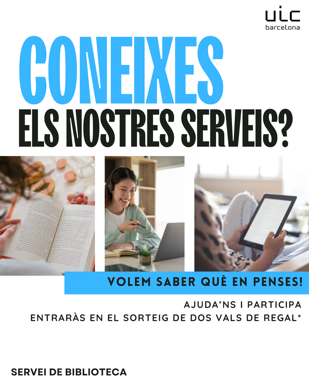 Des de Biblioteca necessitem saber com i quan coneixes dels nostres serveis. És per això que hem fet una enquesta perquè ens puguis demostrar el que saps. Sigui molt o sigui poc a nosaltres ens ajuda per millorar. A més a més, participar pot tenir premi. Sortegem dos vals de regal de 30 € cadascun per fer una compra a qualsevol Abacus. Tens fins al 21 de març per participar. No ho deixis per l'últim moment! Sabrem el resultat del sorteig dilluns 24 de març a través d'Instagram. Podeu arribar al formulari amb els QR que trobareu en els cartells a les dues biblioteques. També des de l'enllaç a la bio i des del Butlletí d'estudiants 05/03. Moltes gràcies per col·laborar!