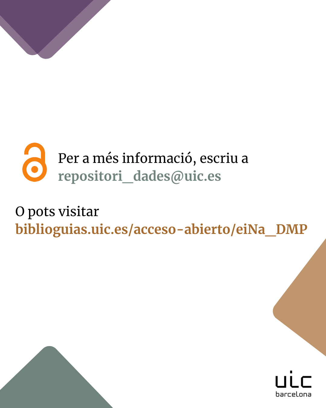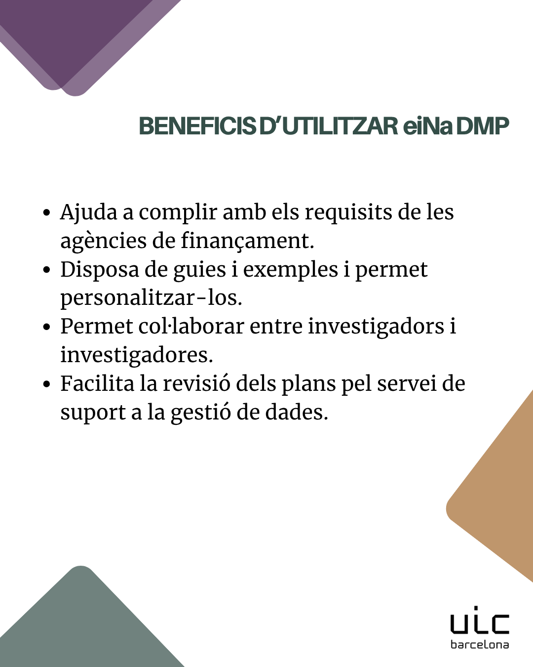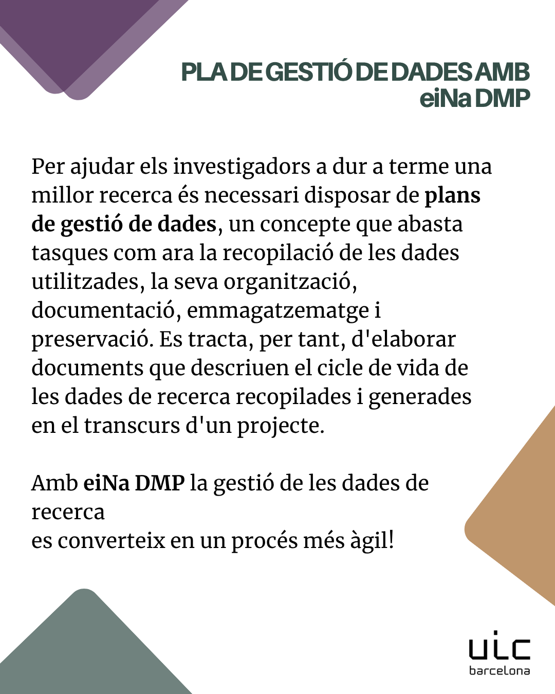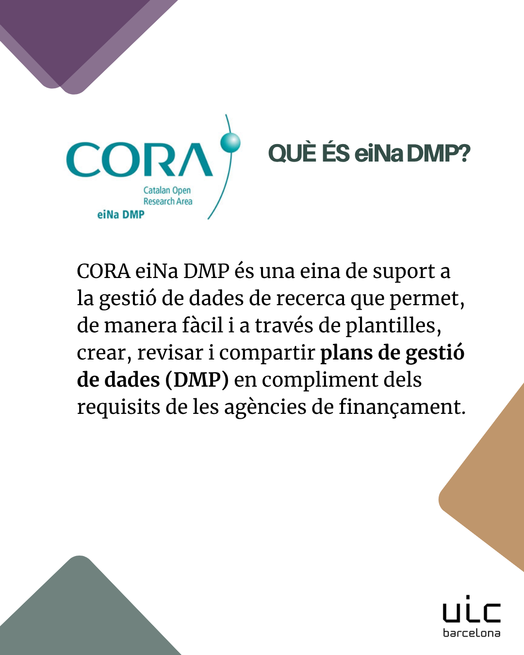 eiNa DMP és l'eina que serveix per a crear plans de gestió de dades. Podeu consultar més informació: https://biblioguias.uic.es/acceso-abierto/eiNa_DMP